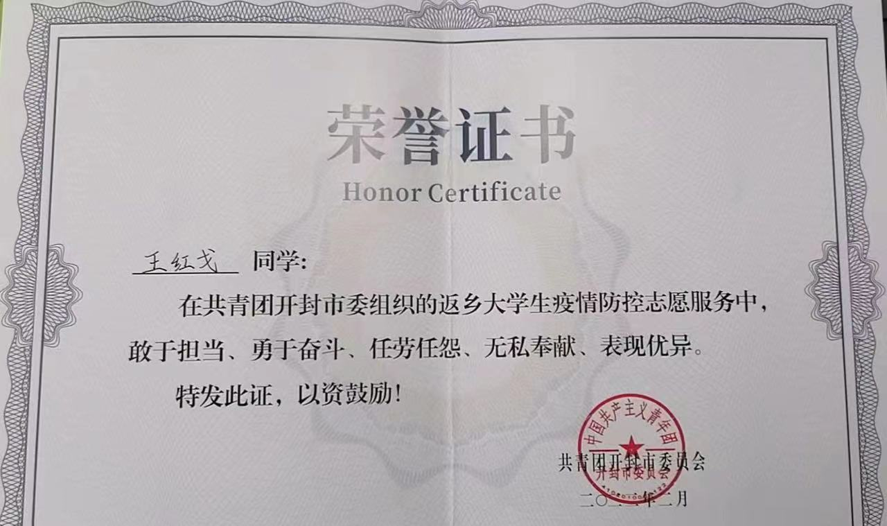 王红戈作为返乡老员工,于2022年初,面对疫情防控的严峻形势,响应共青团开封市委号召,积极参加返乡老员工疫情防控志愿服务,值守在村头巷尾,活跃在乡亲身边,参与双码核查、体温测量、车辆检查、巡逻执勤、物资运送、秩序引导、分类筛查、核酸检测、防疫宣传等工作,筑起了守护人民群众生命健康的青春防线,叫响了“请党放心 强国有我”的青春誓言。