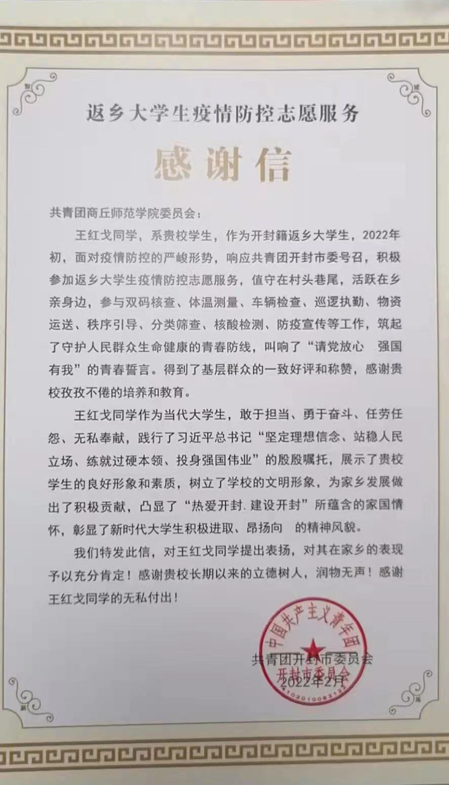 3月14日,公司收到一封来自共青团开封市委的感谢信,实名点赞太阳成tyc7111cc官网体育18-2班王红戈在返乡老员工疫情防控志愿服务中,敢于担当、勇于奋斗、任劳任怨、无私奉献。