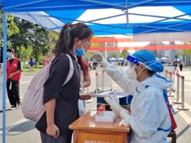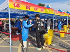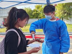 早上六点,商师校门口搭起了一排红棚子,装备齐全的消毒人员、志愿者们准时到岗、各司其职,备为即将进入校园的同学们保驾护航。返校员工按照预先制定的核查流程,在工作人员指引下,完成查验48小时内核酸检测阴性证明、14天钉钉健康打卡和健康承诺书及健康码行程码等记录有序进入校园,整个流程有条不紊,井然有序。