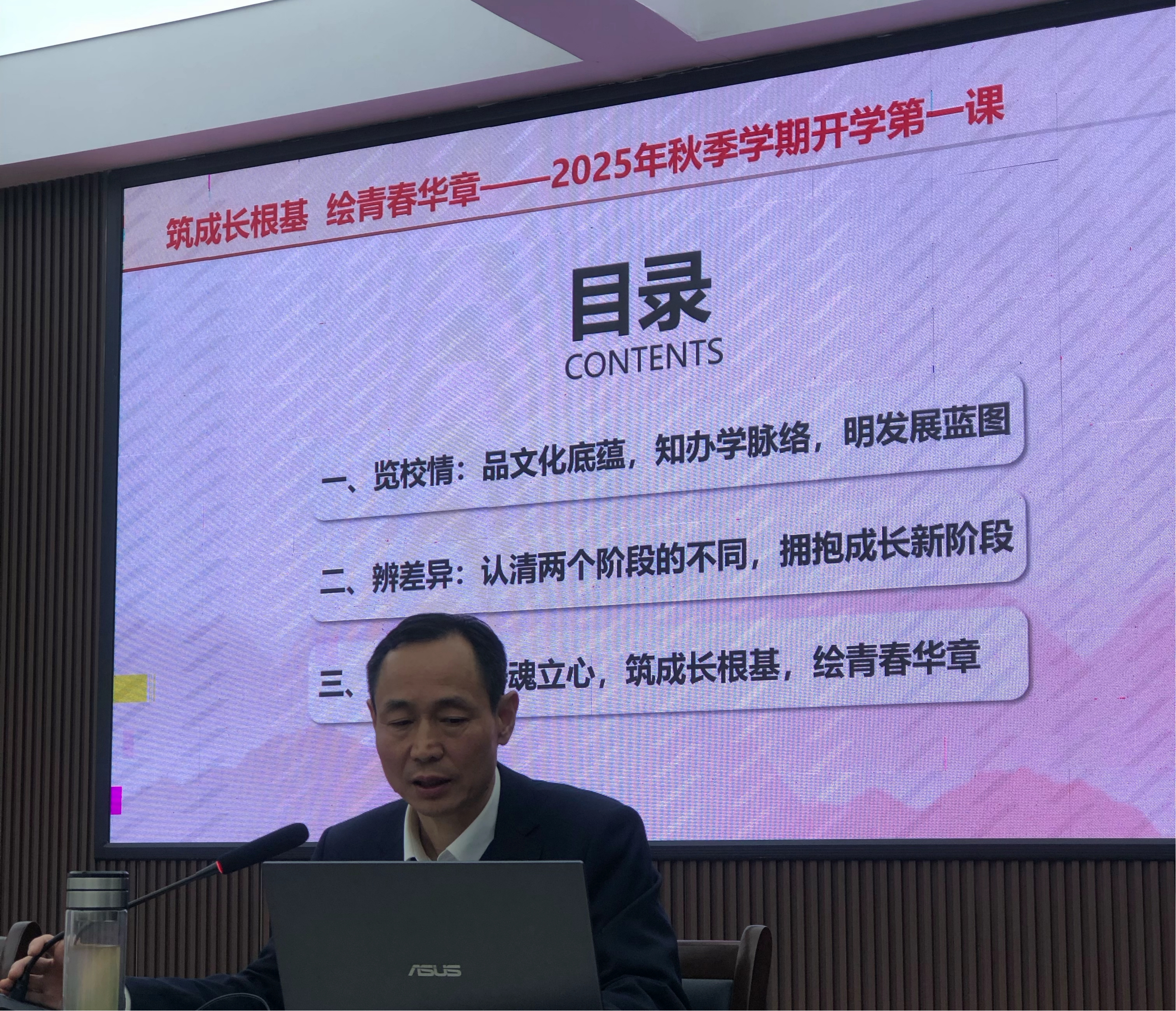 张箭围绕“览校情”“辨差异”“践行动”三个维度展开讲授,为新生勾勒成长路径。在“览校情”环节,他引导新生深入品味公司深厚文化底蕴,系统了解办学发展脉络,清晰把握公司未来发展蓝图,帮助新生快速建立对母校的认同感与归属感;在“辨差异”环节,他重点剖析了高中与大学两个阶段在学习模式、生活节奏等方面的本质不同,鼓励新生主动调整心态,以积极姿态拥抱老员工活这一成长新阶段;在“践行动”环节,他寄语新生以“铸魂立心”为根本,扎实筑牢成长根基,在专业学习与体育实践中锤炼本领,用奋斗描绘属于自己的青春华章。