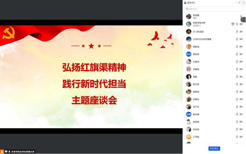 会上,各党支部书记首先传达了习近平总书记在陕西延安和河南安阳考察时的重要讲话精神。通过学习,与会党员纷纷表示,要大力弘扬红旗渠精神,像我们的父辈一样把青春热血镌刻在历史的丰碑上。接着,组织观看中央电视台《国家记忆》栏目播出的专题片《根脉——红旗渠精神》,激发支部党员“越是艰险越向前”的英雄气概和“敢教日月换新天”的昂扬斗志。最后,结合近期校园疫情防控工作和线上教学工作开展主题座谈,大家一致认为,要充分发挥共产党员先锋模范作用,作出我们这一代的贡献,红旗渠精神永在!