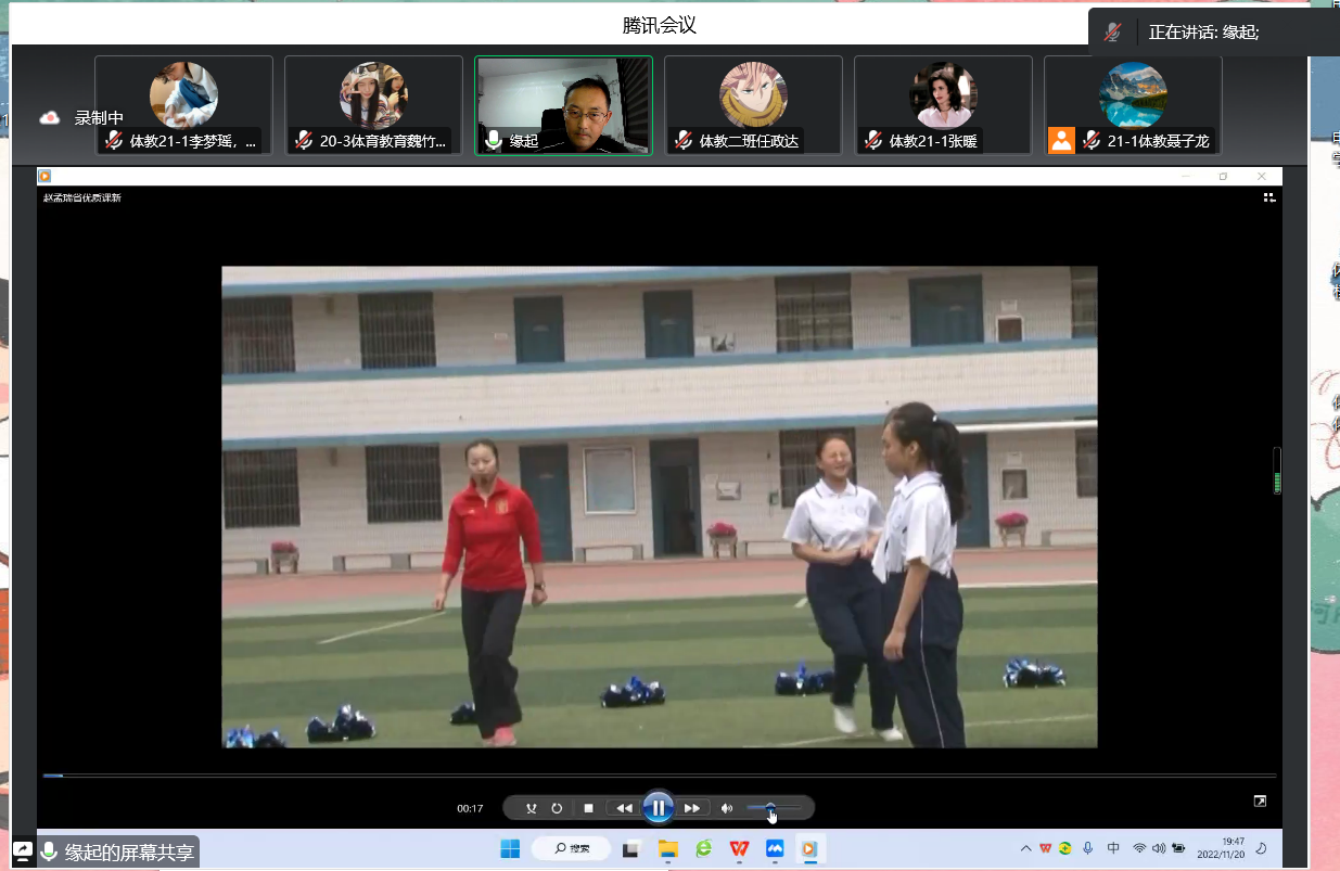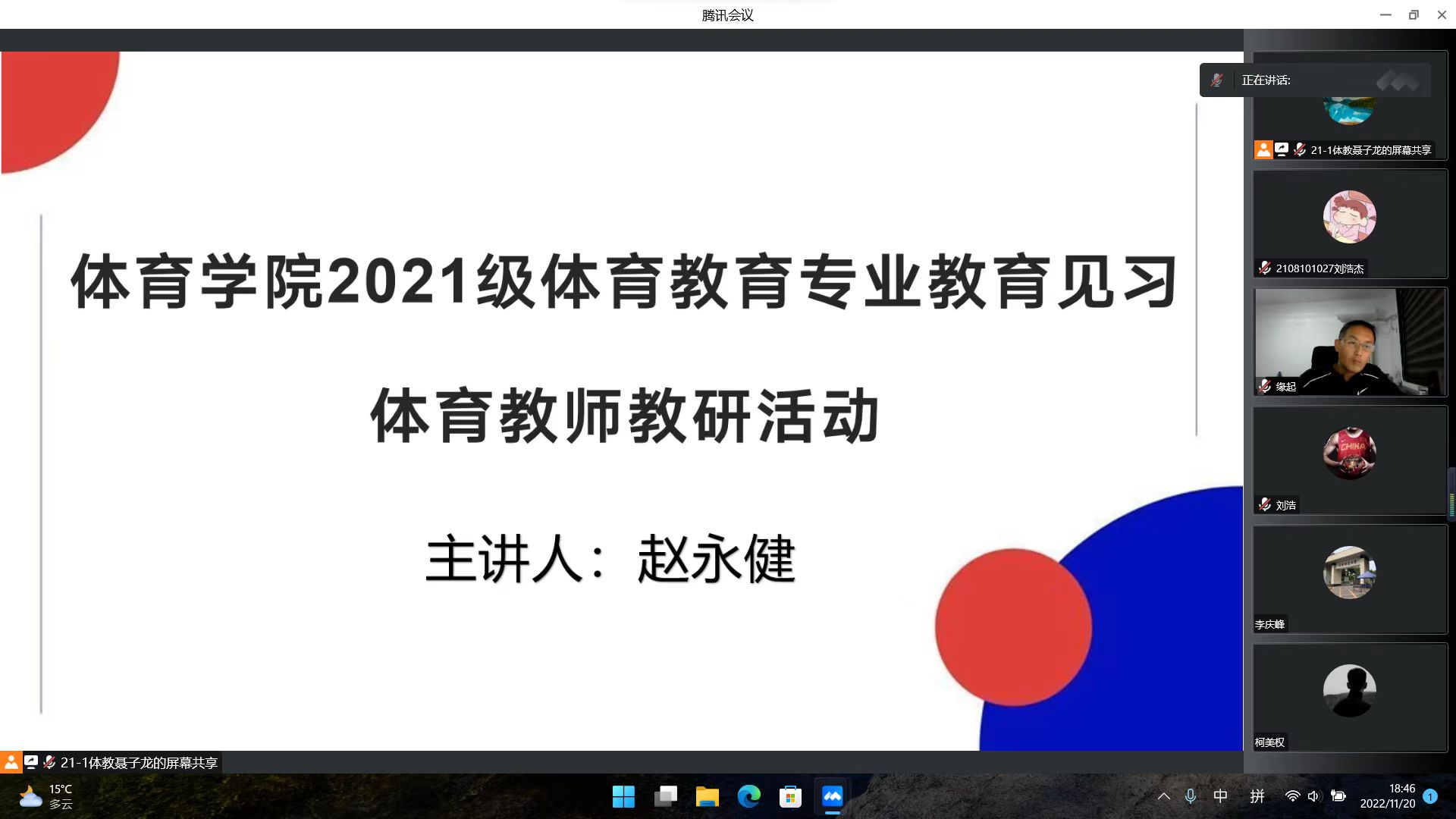 为了加强教师职业建设,营造良好的教学氛围,2022年11月20日晚18时50分,商丘市一中赵永健老师为21级体育教育专业员工开展了体育教师教研活动。