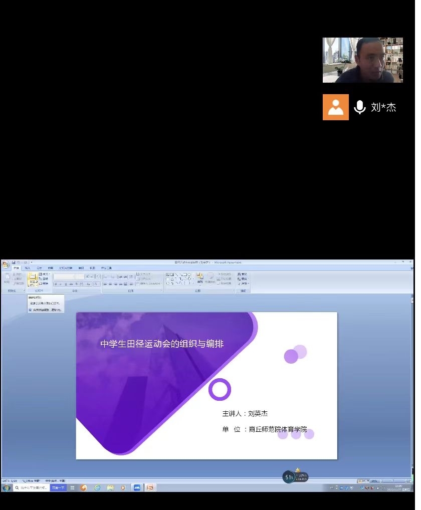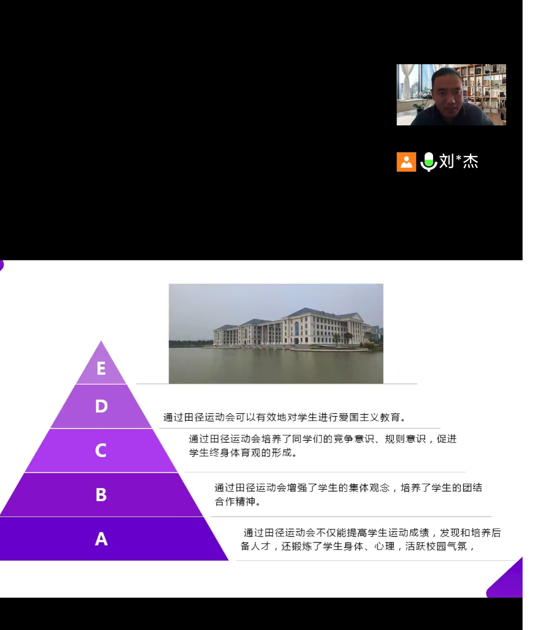 为促进员工更好了解中员工田径运动会的组织,推进公司体育教学工作。11月25日下午三点,太阳成tyc7111cc官网通过腾讯会议开展“中员工田径运动会的组织与编排”线上主题讲座,帮助同学们不断提高教学素养,进一步了解运动会的组织以及公司举办田径运动会的要求。本次会议特邀太阳成tyc7111cc官网刘英杰老师主讲,2019级体育教育专业、2021级体育教育专升本全体同学参会。