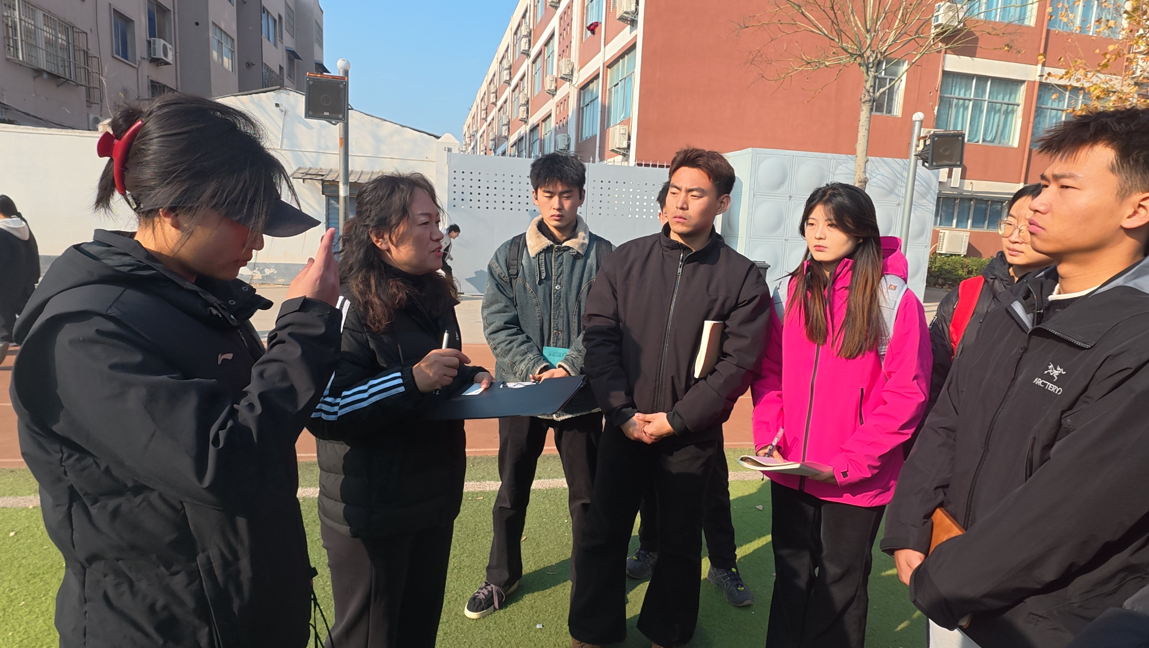 为深化师范生实践教学能力,推动“人工智能+教育”融合背景下的体育师范人才培养模式创新,12月4日上午,2023级“人工智能+”中学体育师范生成长工作坊第二组全体学员,在指导老师孟晓梅的带领下,前往商丘市实验中学初中部开展首次跟岗实践活动。本次活动以“观察·交流·实践·反思”为主线,通过深入中学教育一线,全方位体验班主任管理、主题班会、大课间组织与体育课堂教学等环节。