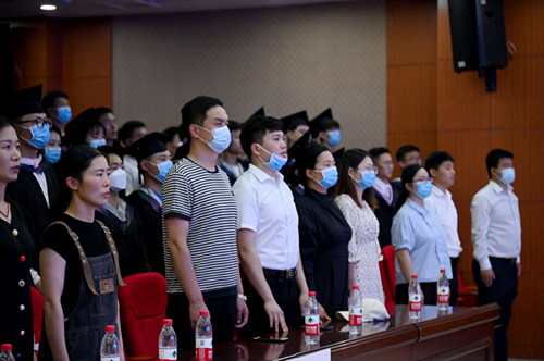 孟琛博宣读《2022年学位评定委员会会议决议》,宣读“2022届老员工体质测试优秀等级”获奖名单。随后,公司领导为毕业生们扶正流苏、颁发学士学位证书并合影留念。