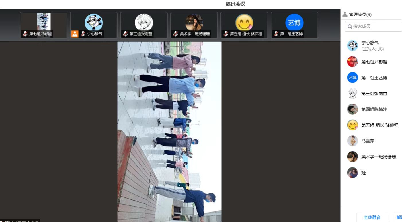 课前,马老师通过学习通发布学习任务;课中,马老师、体育班长、7个小组组长提前进入腾讯会议室,马老师通过腾讯会议远程指导员工进行现场练习,充分发挥了体育骨干的领导和带头示范作用。