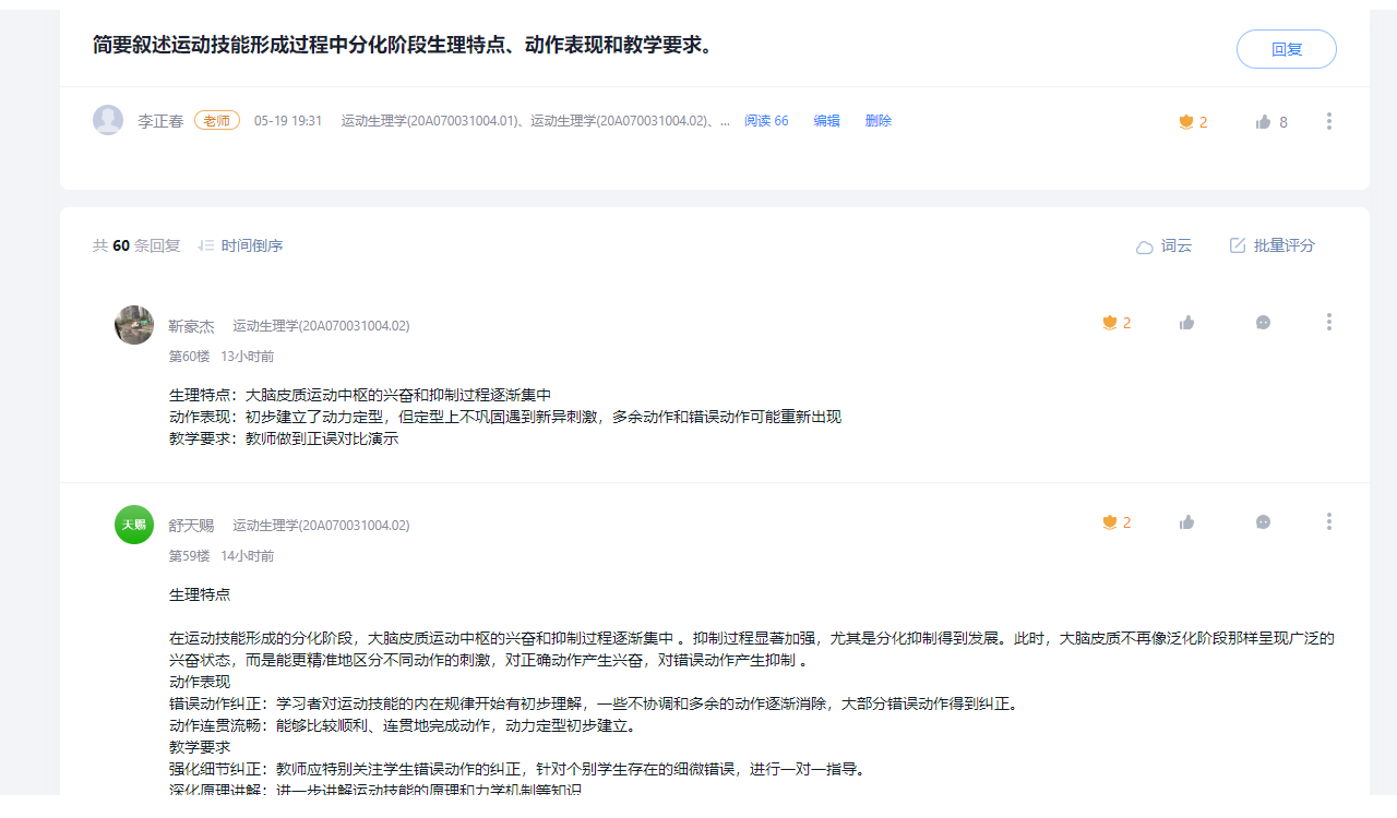 本次课程题目是“运动技能生理本质和形成过程”。李正春老师采用学习通平台线上线下结合、讲授、讨论和提问等方式进行教学。针对运动技能知识模块特点,李正春老师采用对比类推进行教学,利用常见的条件反射引出运动技能的条件反射本质。针对不同阶段运动技能形成特点,同学们在学习通平台上积极发言,老师利用学习通平台讨论“词云”功能引导同学归纳记忆。课后,肖思成主任和张洁老师对本次课程进行了深入点评。他们指出,李正春老师的课堂通过灵活运用学习通平台,将线上线下资源深度融合,以互动化、可视化的教学模式重构了知识传递路径,充分激发了员工的主动性和创造性。
