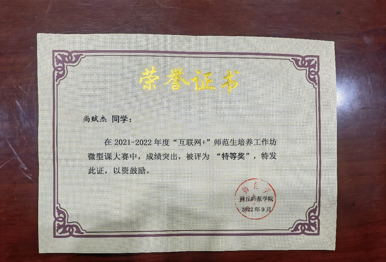 2022年9月25日,太阳成tyc7111cc官网“互联网+”师范生成长工作坊微型课大赛在梁园校区举行,2019级员工尚赋杰代表中学体育工作坊参加此次大赛,最终获得特等奖的好成绩。